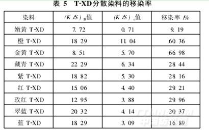 从表5可以看出,除了分散嫩黄T-XD的移染率较低(小于10% ),分散橙T-XD和分散金黄T-XD移染率较高(大于60% )以外,大部分染料的移染率在20% ~30%,基本能满足生产需要。黄色系染料分散嫩黄T-