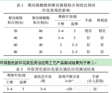 (3)必须与拔染印花浆中一切助剂相容性要好;(4)能在160℃快速(15 s)交联成无色透明的膜,并不堵网;(5)作为环保型拔染印花浆,其粘合剂必须为无甲醛粘合剂;