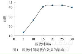 衣片(服装)拔染印花,一般在印花后进行压烫热处理或焙烘热处理,试验了压烫热处理温度为165℃条件下,时间对拔白效果的影响,结果如图1.