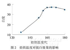 从图1可以看出,压烫时间为20 s时,其白度最好,再延长时间白度无提高.焙烘时间都为90 s,试验了焙烘拔白印花法热处理温度对拔白效果的影响.从图2可以看出,温度为160~165℃时白度最好,温度过低,还原不充分,拔白效果较差,温度过高,白度下降.其原因为:(1)活性染料还原破坏的色素在高温时沾污到织物上;(2)棉纤维在湿热状态下泛黄.因此,焙烘法拔染印花,其温度的控制很重要.