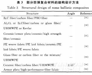 防弹材料自问世以来就以迅猛的速度向前发展,由早期的普通金属防弹板到单层的纤维增强树脂基体的防弹复合材料,再发展到当今多层次、梯度化结构复合材料。表3为部分国内外关于防弹复合材料的结构设计。