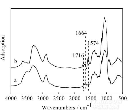 图 2 粘胶纤维的傅立叶变换红外光谱:a. 未交联粘胶纤维;b. 经 BTCA 交联后的粘胶纤维。