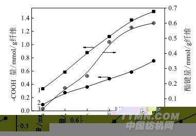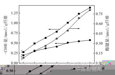 不同交联时间下经 BTCA 交联后粘胶纤维上总的参与酯化反应的羧基量、残留的羧基量以及生成的酯键量的变化情况分别如图 6 中曲线 1、2、3 所示。随着交联时间的延长,总的 参与酯化反应的羧基量逐渐增加,交联后粘胶纤维中残留的羧基量和生成的酯键量都是逐渐增加的。