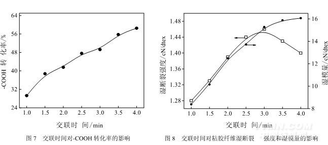 图 8 为交联时间对粘胶纤维湿断裂强度和湿模量的影响。由图可见,随着交联时间的延