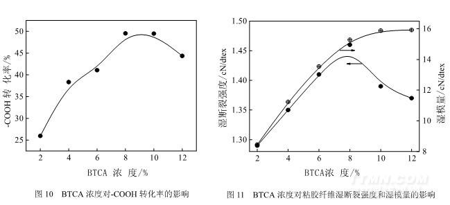 图 11 为 BTCA 浓度对粘胶纤维湿断裂强度和湿模量的影响。由图可见,随着 BTCA 浓