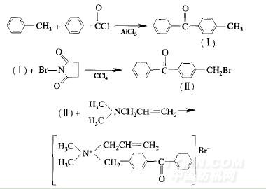 在合成二甲基烯丙基对苯甲酰苄基溴化铵的过程中,先制备4一溴甲基二苯甲酮,然后将其与二甲基烯丙基胺反应.产物经核磁共振光谱等表征,确定其已经生成.主要反应过程如下:
