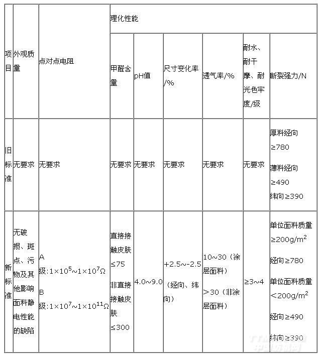 新标GB12014—2009《防静电服》对面料技术要求增加了9个项目,对服装技术性能、服装分级、测试环境条件等方面作了更细化的修改和更科学的补充,使新标更趋于合理和可操作。现就新旧标准中的技术指标和测试方法不同点进行剖析对比。