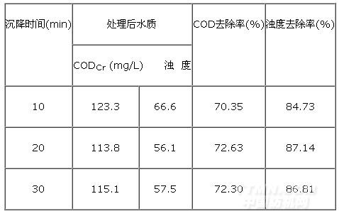 分别量取三份200mL水样于干净烧杯中,调节溶液pH值到8,再加入0.1g PAC絮凝剂,以150r/min的搅拌速度作用10min。第一个烧杯静置10min后,取上层清液,测CODCr、浊度等指标;第二个静置20min后,测各项指标;第三个静置30min后,测各项指标。以此考察沉降时间对CODCr、浊度去除率的影响。结果如表6所示。