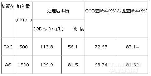 按照PAC实验的步骤,进行同样的实验。我们得出AS的最佳加入量为1500 mg/L,最佳絮凝pH值为8。在此最佳絮凝效果的情况下,AS对印染废水的处理效果达到:CODCr去除率达68.74%,浊度去除率达81.32%。与PAC絮凝效果进行对比,得表7。