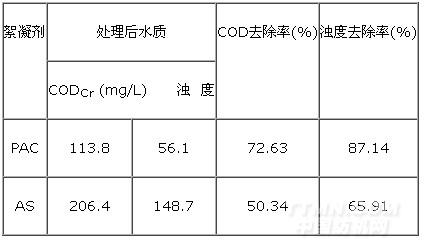 分别取两份200mL水样于干净的烧杯中,各加入0.1g PAC、AS絮凝剂,以150r/min的搅拌速度作用10min,静置沉降20min,取上层清液,测定CODCr、浊度,计算去除率。结果如表8所示。