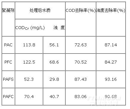分别量取三份200mL印染水样于干净烧杯中,调节溶液pH值到8,分别加入0.1g PAC、PFS、PAFS絮凝剂,以 150r/min转速搅拌10min,静置沉降20min,取上层清液,测定CODCr、浊度。所得结果如表10所示。