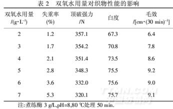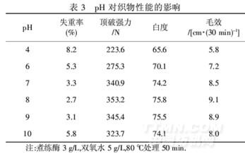 从表3可知,织物的失重率随着pH的增大先减小后增大,而织物的强力随着pH的增大先增大后减小,原因是强酸对纤维素纤维的损伤很大,纤维素发生了降解,使得失重率较大,强力损伤严重;当pH=7~9时,失重率明显比酸性条件小,对纤维素损伤较小;碱性较强对纤维素也有一定的损伤,此时的失重率又有明显上升,强力也有下降;织物的白度和毛效都随着pH的增大先增大后减小,但过酸或者过碱使得酶失去活性,不能与双氧水较好的发挥协同作用去除杂质,使得织物的白度和毛效变化都很小.综合考虑,选择pH=8.