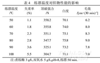 从表4可知,在80℃酶有较大的活性,使得织物的失重率适中,强力损失较小,白度和毛效较高;当温度高于80℃时,失重率上升趋势较大,织物的强力损失比较明显,织物的白度和毛效都开始减小.综合考虑,练漂温度为80℃比较适宜.