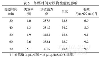 从表5可知,随着练漂时间的延长,虽然酶能够与双氧水充分发挥协同作用,但是织物表面的纤维素纤维发生了水解,使得织物的聚合度下降,则织物的失重率增大,强力下降;随着练漂时间的延长,杂质及共生物的去除,可使织物的白度和毛效得到提高.综合考虑,练漂时间为50 min比较适宜.