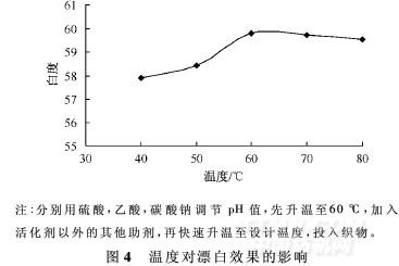 温度对漂白效果的影响如图4所示。由图4可以看出,随着温度的提高,织物的白度先提高后降低;过氧酸等有效漂白成分的反应速率提高,相同时间内参与漂白的过氧酸量增加,织物的白度提高;过氧酸稳定性降低,无效分解率增加,起漂白作用的有效成分减少;开始时,漂白速率增加为主要方面,织物的白度增加;到达一定温度以后,漂白有效成分减少成为主要方面时,织物的白度开始下降。由图4可知,60℃时织物的白度最高。
