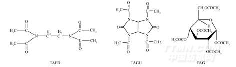 四乙酰乙二胺(TAED),四乙酰甘脲(TAGU),五乙酰葡萄糖(PAG)是文献中经常报道的3种活化剂。3种活化剂的分子结构为: