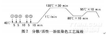 涤棉织物一浴法染色有两种方法,即一浴一步法和一浴两步法。与一浴两步法相比,一浴一步法流程更为简单、时间短、耗能省,但对染料的要求比较高,在染料选择和工艺设计中有一定的难度。一浴一步法染色又可分为酸性、中性、碱性和pH值滑移法等4种方法。本试验选用中性条件,用缓冲剂调节pH值为7,所用染色织物为涤棉(85/15),浴比1:l0,染色工艺流程见图2。