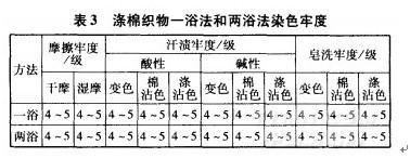 将涤棉织物用一浴法与两浴法两种工艺进行染色,测试两种方法染色织物的色牢度,结果见表3。