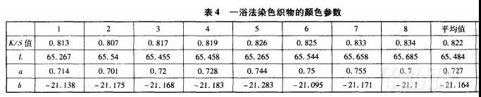 由表4可以看出,一浴法染色后涤棉织物K/S值和L,o,b值的标准偏差都比较小,说明匀染性较好。