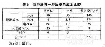 由表6可以看出,一浴法染色比两浴法染色成本大为降低,如果一只染缸染1400In布,则每米布可以节省成本0.41元,经济效益相当可观。