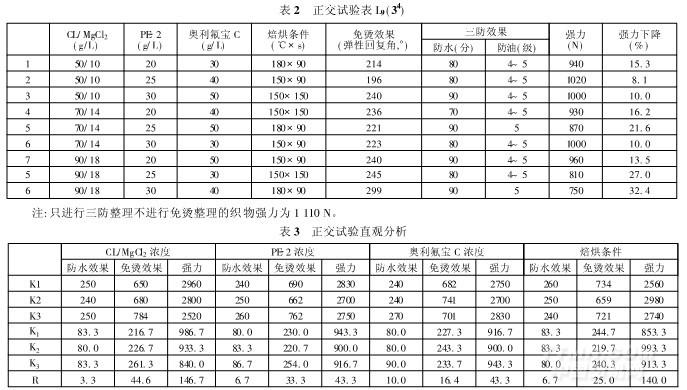 烘条件为 150 90 s 。据此 , 我们可根据不同的需要而选择相应的优化工艺 , 以达到最佳的整理效果。对织物三防效果、免烫效果和强力下降兼顾的最佳工艺条件为 : 当奥利氟宝 C 浓度变化时 , 对织物的三防效果的影响最大 , 但免烫效果和强力变化都比较小 , 故选取 50 g/ L 的组分浓度 ; 当 PE 2 浓度选取 30 g/ L 时 , 织物的三防效果和免烫效果都比较好 , 织物强力下降适中 ; 当焙烘条件和 CL/ MgCl2浓度分别变化时 ,其对织物强力和免烫效果均影响较大 , 分别选择 CL/ MgCl2的浓度为 70/ 14 g/ L 、焙烘条件为 180 90 s 。