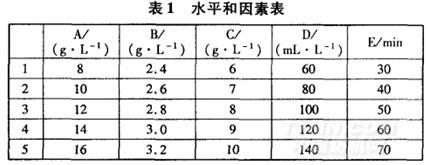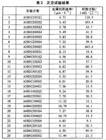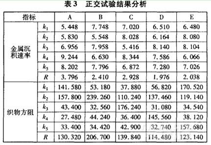 化学镀工艺应尽可能提高金属的沉积速率,并降低织物表面方阻。以PANI/PA织物为基质,固定化学镀温度为30℃,选定影响Ag/PANI/PA织物金属沉积速率和方阻值的五个主要因素,即硝酸银质量浓度(A)、葡萄糖质量浓度(B)、氢氧化钠质量浓度(C)、氨水质量浓度(D)和时间(E)作为影响因子(见表1),以沉积速率和织物方阻为考查指标,进行正交试验,结见表2和表3。