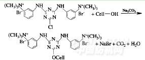 均三嗪基季铵盐化合物是一类反应活性较高的阳离子改性剂,按活性基团的多少又可分为单活性单季铵盐、单活性双季铵盐和双活性多季铵盐.由于反应活性高,此类化合物可以使纤维有效地接上阳离子,其热稳定性好于环氧类化合物.双活性多季铵盐改性剂可提高其与纤维的结合力,大大减少试剂用量.但也使大部分试剂与纤维表面的羟基反应而未渗透到纤维内部,易造成环染,影响染色布样的鲜艳度.单活性双季铵盐与棉纤维反应的方程式如下[2]: