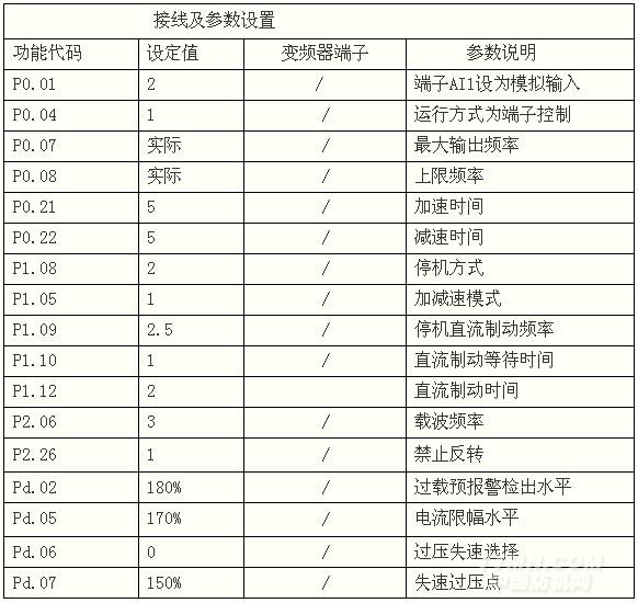 在大圆机运转中,绝对不能让电机反转以及回转现象,否则针床的针将被折弯甚至断针。有些大圆机接入单向轴承,可不予考虑。要是系统正反转完全取决于电机的正反转控制,则需要设置合理的参数,一方面要设置禁止反转功能,另外一方面需要直流制动功能。还要注意不能出现失速现象,以免造成断针等损失。本方案采用模拟量输入给定频率。线路简单(省略)大圆机要求起动时响应要快,低频大转矩输出;停机时要光滑、柔和一些,以保护针床。因此合理设置上表参数是充分发挥圆机性能的保证,原则是通过调解P0.19,P9.00参数得到最佳的低频转矩输出能力以及降低圆机高速运行的振动,通过调起停控制(P1组)以及加减速度时间参数(P0组)得到频率调节的光滑性。
