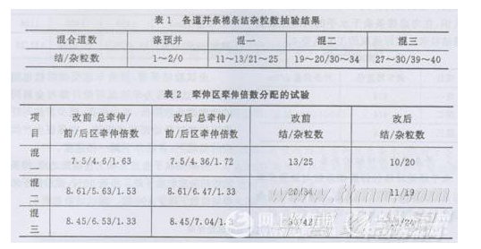 在总牵伸倍数不变的情况下,混一加大了后区牵伸倍数,混二、混三分别减少了后区牵伸倍数,集中了前区牵伸倍数,棉条的结杂粒数下降了40%左右。
