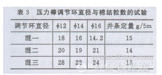 在A272F型并条机上采用的是压力棒曲线牵伸,压力棒在牵伸区起强控制纤维的作用,有利于提高棉条干质量,压力棒对纤维的控制强度取决于其调节环的直径大小,直径小控制力强。但涤纶纤维蓬松性较大,控制力强弱是否对棉结的产生有应响,为此我们对压力棒调节环的直径大小规格做了三种试验,见表3。