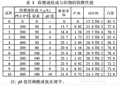 试验考察了阻燃剂PVA-P-Ti和尿素用量对整理织物阻燃性能的影响,结果见表1。