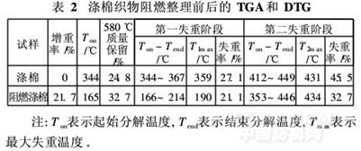 按上述优化工艺对织物进行阻燃整理前后的热重分析测试(TGA)和差示扫描热量分析(DTG),结果见表2。
