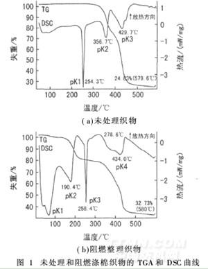 图1是阻燃整理前后织物的TGA和DSC测试结果。