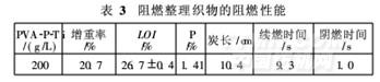 从表3看出,经阻燃整理的涤棉织物增重率高于20%,磷含量超过1. 4%,LOI值达到26%以上,在垂直燃烧测试中能够达到高火自熄,说明PVA-P-Ti阻燃剂有较好的阻燃效果。