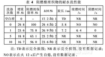 按最佳阻燃液组成(阻燃剂PVA-P-Ti 200 g/L,尿素80 g/L, pH值4)对织物进行处理,再按1. 3. 7节方法测试阻燃织物洗涤1次、5次和10次后的阻燃性能,结果见表4。