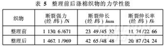 按优化阻燃液组成(阻燃剂PVA-P-Ti 200 g/L,尿素80 g/L, pH值4)对织物进行处理,按1. 3. 6节方法测试整理前后涤棉织物的力学性能,结果如表5。