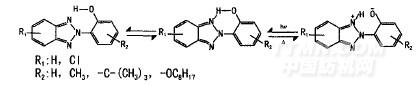 为减少紫外线对人体的危害,抑制或延缓高分子材料的光降解,人们将光稳定剂添加在化妆品、纺织品和高分子材料中。其中,纺织品中最常用的光稳定剂是紫外线吸收剂,这是一类能强烈吸收紫外线并且能够将吸收的能量以热能等危害较小的形式释放出去的有机物质J。苯并三唑类紫外线吸收剂则是目前品种最多、产量最大的紫外线吸收剂J。该类紫外线吸收剂以酚类结构存在,吸收紫外光后,质子可快速转移到氮原子上而形成互变异构体,并迅速将多余的能量转化成热能释放,回到基态。整个互变过程效率极高,周而复始。其结构及作用机理如下: