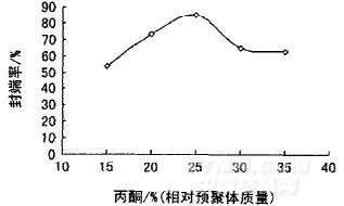预聚反应完成后,体系有一定的黏度,在进行封端反应之前,需加入一定量的溶剂,以降低体系黏度,此时溶剂的作用是稀释预聚体,使大分子充分舒展,很好地连接油水两相,促进封端反应。丙酮溶剂(相对预聚体质量)对封端反应的影响见图7。