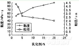 本试验采用外乳化法,将封端后的聚氨酯缓慢加入含有乳化剂的水中,搅拌形成粗粒乳液,再送入高剪切乳化机中乳化形成稳定乳液。根据乳化荆的选择要求,通过筛选发现,采用乳化剂AEO-9和OEP-982以3/2的比铡复配后乳液稳定性最佳。乳化剂质量分数对黏度和粒径的影响见图8。