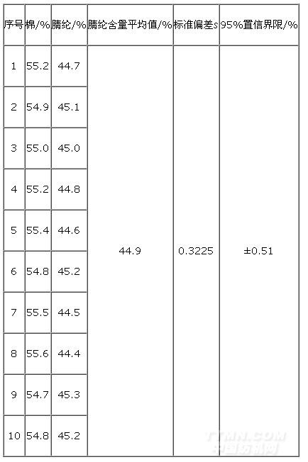 由表6 可知,对于同一混纺产品,经过10次溶解试验,在置信度为95%时,得到腈纶的置信界限为±0.51%,小于GB/T2910.1—2009所要求的±1%。