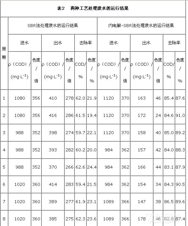 试验表明,废水经过内电解反应后,可生化性由原来的0.45~0.50提高到0.70~0.75。这是因为印染废水中的染料、大分子等物质经过内电解处理后,由于新生态物质Fe2+,H的氧化还原作用,一些不饱和键打开使发色基团破坏,硝基物转化成胺基物,大分子物质分解成小分子的中间体[3],在发挥脱色作用的同时,使CODB值往往高于原水,改变了废水的可生化程度,为后续生化处理创造了有利条件。