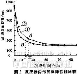 从图3可以看出,A点是曲线①即SBR工艺活性污泥沉降曲线的压实点,发生在开始沉降后第22min,B点是曲线②即内电解-SBR 艺活性污泥沉降曲线的压实点,发生在开始沉降后第17min,要比SBR工艺压实点提前5min,也就是说,相同量的活性污泥,内电解-SBR工艺要比SBR工艺沉降得快,这一点有利于提高对反应器的利用率。内电解-SBR法的沉降曲线始终在SBR法曲线的下方,又说明.了内电解-SBR法污泥的压实性能也优于SBR法,从而使SBR反应器内的污泥浓度大大提高。另外由30 min时的固—液面位置可分别求得两种工艺的污泥沉降比SV,SBR法的SV为28.5%,内电解-SBR法的SV为23%,明显低于SBR法,进一步说明了内电解-SBR工艺中活性污泥比重大,易于沉降,有利于在反应器内保持浓度较高和沉降性能较好的活性污泥,这对比重较小的印染废水污泥来说是很有利的。