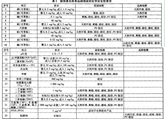 德国是目前全世界对纺织品安全性要求较高的国家之一,无论是法规要求还是品牌要求都比较全面和严格。某世界著名的德国体育品牌服装的安全质量要求比较具有代表性,其对服装产品制定了较为严格的化学安全要求,即普通服装和功能性服装应执行相同的化学安全性标准。表l为该品牌部分可能涉及功能纺织品的化学安全性要求。