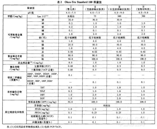 该标准于2011年1月1日再次更新,部分功能纺织品可能及的化学物质限制见表2…。值得注意的是,基于REACH法已将短链氯化石蜡(C10一C13)和三(2.氯乙基)磷酸酯列人SVHC候选清单的考虑,新标准也将这两种物质列人了禁用阻燃物质清单和其它禁用的(残留)化学品清单。同时,总铅含量均调整为90mg/kg,这一指标严于美国CPSIA规定的300mg/kg的限值,也严于其可能于2011年8月实施的100mg/kg的限值,这些修订对希望符合该标准的功能纺织品提出了新要求。
