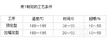 定型温度要根据织物的弹性缩水率、厚薄而定,如温度过高,则强力下降,弹性降低,织物有变色的可能。定型温度过低,织物易卷边,幅宽不稳定,缩水率大;一般情况在90~150℃范围内,短时间不会受到影响,共其软化点为205℃~210℃,90℃时强力不下降,温度在170℃~185℃时间20~50S,(因氨纶的产地,品种而异需经试验决定)为宜,门幅要比成品要求大10%~20%(因强物的自然回缩)。