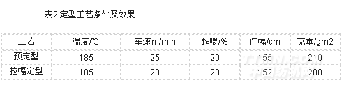 实验织物:18tex棉与3.3tex(40D)氨纶(95:5)交织的弹力针织布;客户要求:成品门幅150cm克重210g/m2使用针板拉幅定型机:工艺条件见表2