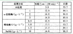 将竹材Lyocell纤维织物分别用β-淀粉酶(质量浓度为1~3g/L)、精练酶G(质量浓度为0.5~1.5g/L)和l0L的NaOH进行退煮,然后用H2O2漂白,处理后织物白度和毛效见表1。