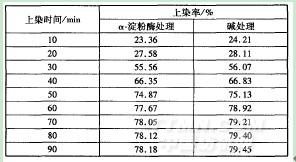 表2中,一淀粉酶和碱处理的竹材Lyocell纤维织物上染约55min后,上染率分别达到77.1%和78.3%,略低于棉织物的上染率(81%)和上染平衡时问(约50min)。用精练酶G处理的织物进行染色时,其上染