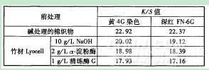 将经过不同条件前处理的竹材Lyocell纤维织物和棉织物用活性染料NOVACRON黄4G和NOVA.CRON深红FN-6C分别染色,然后测定其K/S值,结果如表3所示。