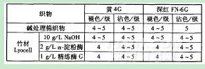 将经过不同条件前处理的竹材Lyocell纤维织物和棉织物用黄4G和深红FN-6G分别染色,测定其耐洗色牢度,见表4。